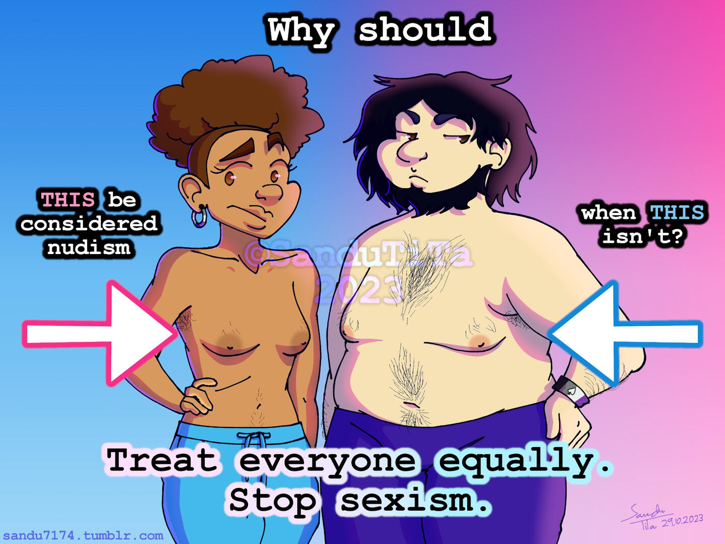 I decided to give this topic its own section since it's become so important to me. I frankly find it ridiculous how modern society views female-presenting nipples and breasts.Male-presenting (MP) and female-presenting (FP) nipples are so similar; they're both these funky little knobs with areolas around them, everyone has them and everyone loves them! And yet... 50 % of the world's population, most of which are women, isn't allowed to show theirs in public. In fact, 50 % are only allowed to show theirs in explicitly pornographic settings, nowhere else. Isn't that just fucking insane and cruel? Not to mention misogynistic and sexist. It shouldn't be like this. This isn't gender equality.But it's normalised, so no one questions it. People go on and on about how society is so much better about gender equality these days, and then they completely ignore this blatantly misogynistic issue still very prevalent today. It frustrates me to no end. Male nipples are okay, female nipples aren't, and everyone goes on with their lives. Laws say that men don't have to cover up but women do, and everyone goes on with their lives, not giving a hoot. Social media like Instagram and YouTube forbid FP nipples and let MP ones off the hook. There are still laws in the modern Western world justifying MISOGYNY and no one cares! What gives? How can we get people to care about this more? These laws need to change. Social media has to change. Radical action has to take place.I am just one measly little human who struggles to feed themself and can only draw and play Minecraft. There's not much I can do alone. One thing I can do is make art about this subject, which I have done;